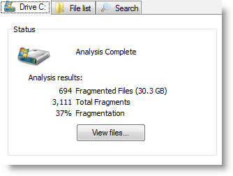 1. Click on the Analyze button. After a few seconds, the analysis is done, giving you a summary of files that are fragmented, how many total fragments are there, and how much fragmentation exists on your disk drive.