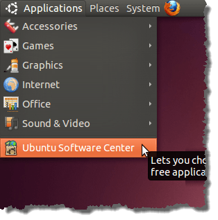 To be able to use Windows 7 Theme wallpaper images in Ubuntu, you need to install 7zip, so you can easily extract the files. 7zip is a useful compression utility to have. To install 7zip, select Ubuntu Software Center from the Applications menu.