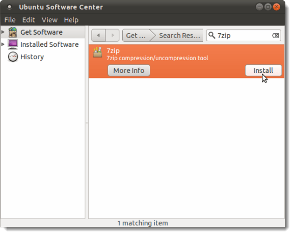 Enter “7zip” (without the quotes) in the search box in the upper, right corner of the Ubuntu Software Center dialog box. As you type, programs that match what you have types so far are automatically listed. When you see 7zip, select it and click Install.