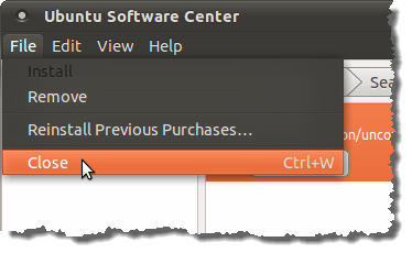 The installation begins, the progress being reported on the Ubuntu Software Center dialog box. When the installation is finished, close the Ubuntu Software Center by selecting Close from the File menu.
