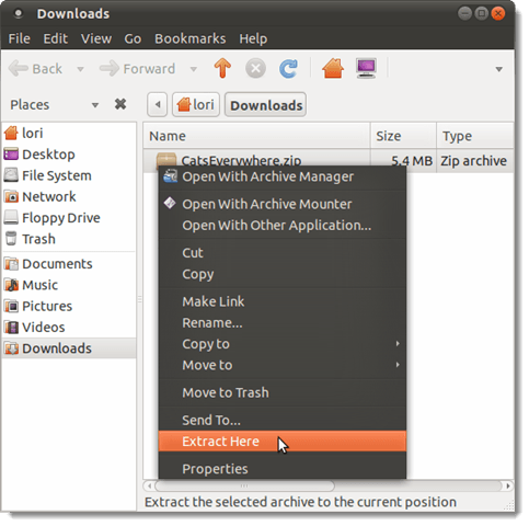 Now, you can unzip the file. Right-click on the newly renamed .zip file again and select Extract Here from the popup menu.