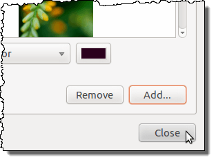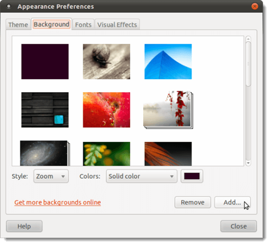 The Appearance Preferences dialog box displays. Make sure the Background tab is active and click the Add button in the lower, right corner of the tab.