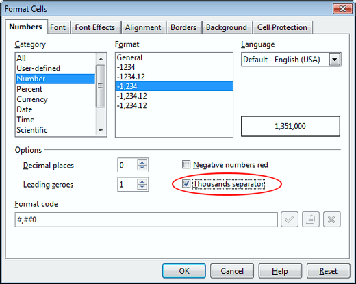 By default, OpenOffice Calc displays numbers as a long string of digits without any way to tell exactly where the thousands separators are. This makes it difficult to tell at a glance how large a number is when the numbers in your cells reach into the thousands, ten thousands, hundred thousands, millions, or beyond. Select a group of cells that have large numbers and open up the Format Cells window as described above. Locate and select the option titled Thousands Separator.