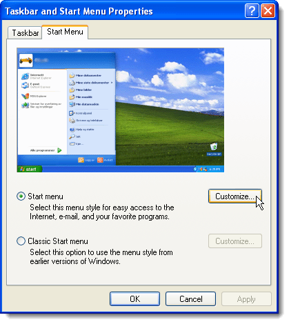 The Taskbar and Start Menu Properties dialog box displays. Click the Start Menu tab and, then, click the Customize button.