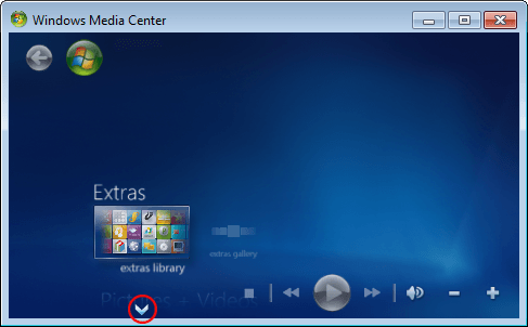Open Windows Media Center and hover the mouse near the bottom left of the screen until the navigation arrow appears.
